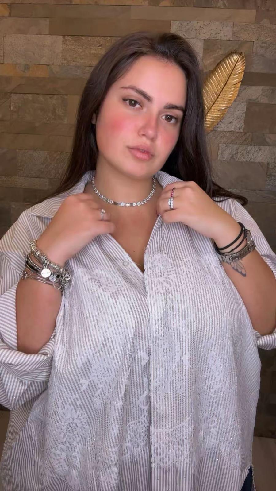 Camicia curvy gessata con pizzo e micro strass WQ2222